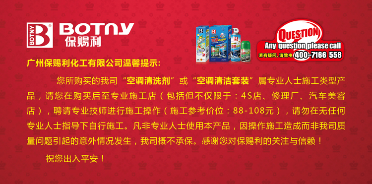 因我司研制并首推的“空調清洗劑”及“2013年上榜中央電視臺的“空調清潔套裝”均屬專業施工類產品,施工過程雖無需專業設備,但在施工過程中涉及專業知識及專業技能,因此,我司建議各位買家在購買上述產品后,在無任何專業人士指導下請勿自行施工,以免造成因操作不當而引起意外情況發生。凡非專業人士操作施工而引起的意外情況發生,因操作施工造成而非我司質量問題,我司概不承保。