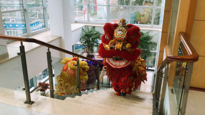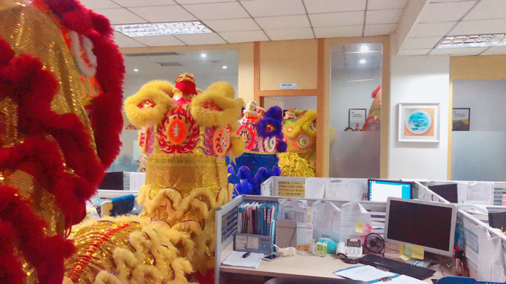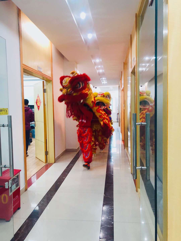 隨后,各彩色舞獅在鑼鼓聲中來到各辦公區域向各位員工拜年,