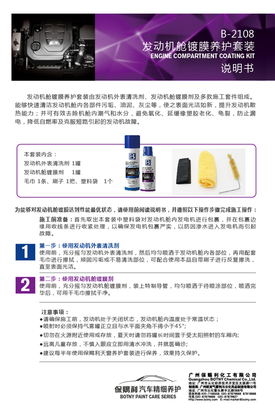 發(fā)動機艙鍍膜養(yǎng)護套裝由發(fā)動機外表清洗劑、發(fā)動機艙鍍膜劑及多款施工套件組成。能夠快速清潔發(fā)動機艙內(nèi)各部件污垢、油泥、灰塵等,使之表面光潔如新,提升發(fā)動機散熱能力;并可有效去除機艙內(nèi)潮氣和水分,避免氧化、延緩橡塑膠老化、龜裂,防止漏電,降低自燃率及克服短路引起的發(fā)動機故障。