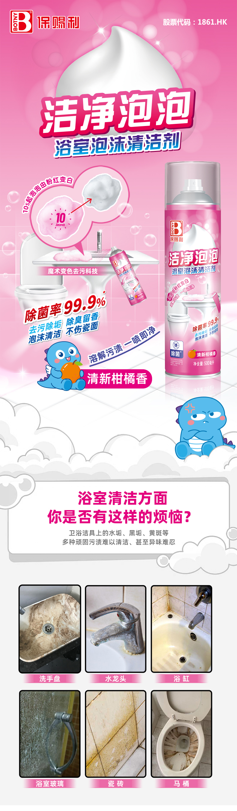 保賜利浴室潔凈泡泡,去污除垢、除臭留香、柑橘清香。